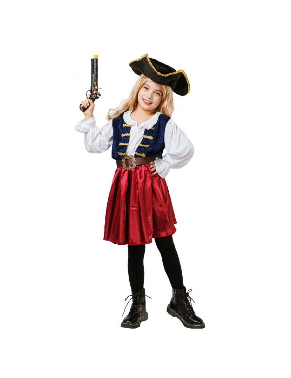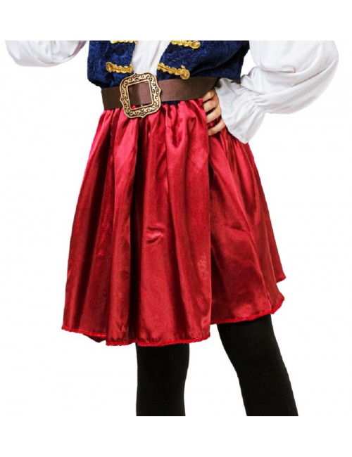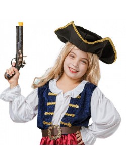 Costum fetita Pirat, Elegant Pirate, contine: Palarie, Centura si Rochie cu vesta atasata. Rochia are top din lycra alba si catifea albastra, garnitura aurie, elastic in talie si fusta din satin grena.