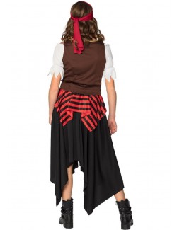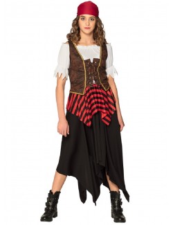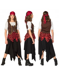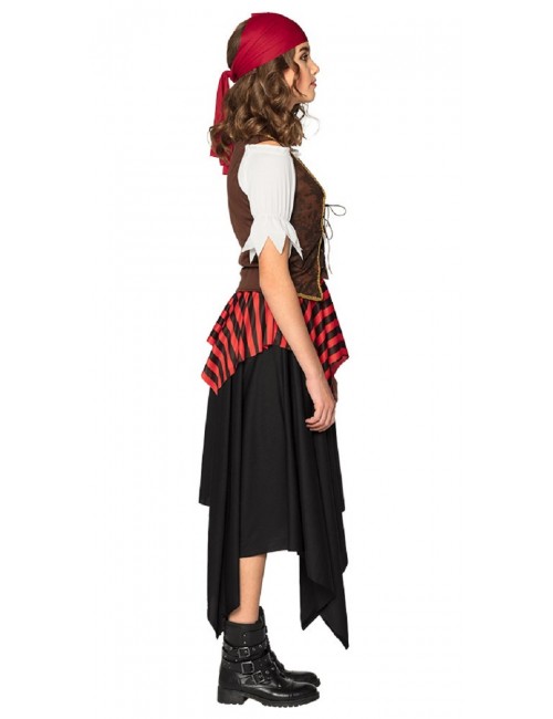 Costum adolescente, Pirat Tornado, pentru 14-16 ani, contine: Rochie lunga, asimetrica, vesta-corset maro si bandana rosie.