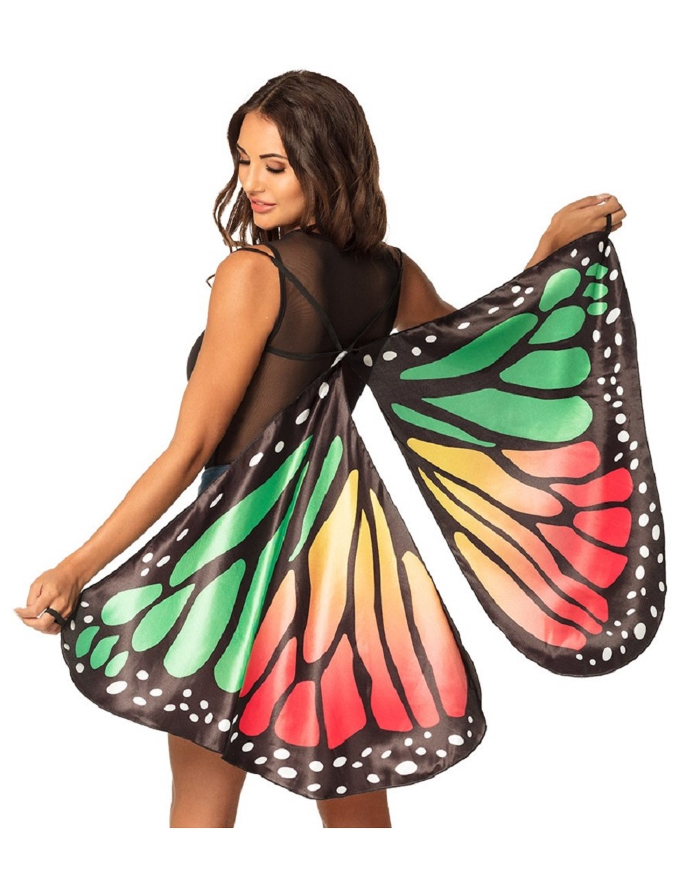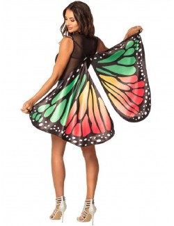 Aripi fluture, multicolore, dimensiuni 130 x 83 cm, prindere cu elastic dupa umeri si degete, din satin imprimat, 100% poliester.