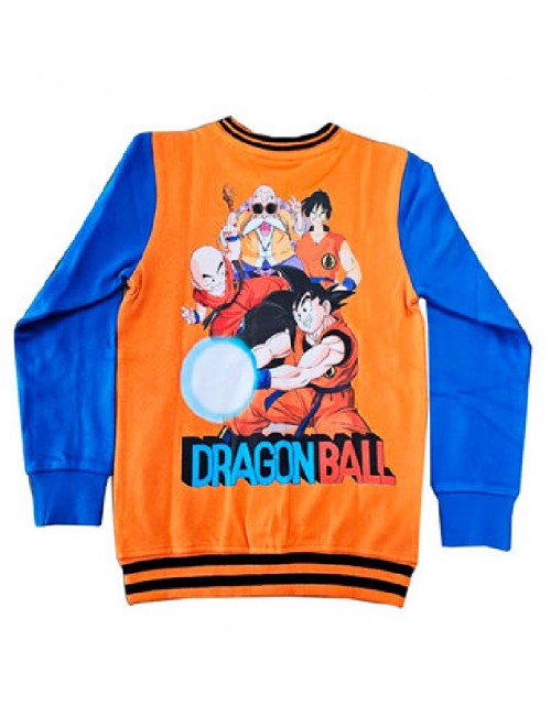 Jacheta Dragon Ball, stil college, culori portocaliu-albastru, material usor flausat, cu buzunare laterale, inchidere cu capse, banda elastica la maneci si in talie, imprimeu pe piept si pe spate.