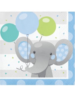 Set 16 servetele, Elefant, culori alb-bleu, dimensiuni 25 x 25 cm (extins), din 2 straturi de hartie, perfecte pentru petreceri tematice.