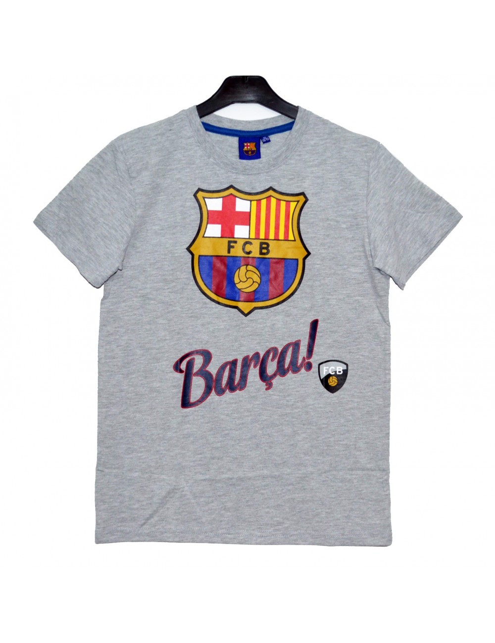 Tricou gri, FC Barcelona, maneca scurta, decolteu rotund, imprimeu cu emblema Clubului, material 95% bumbac, 5% poliester.