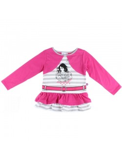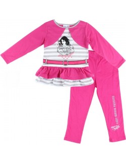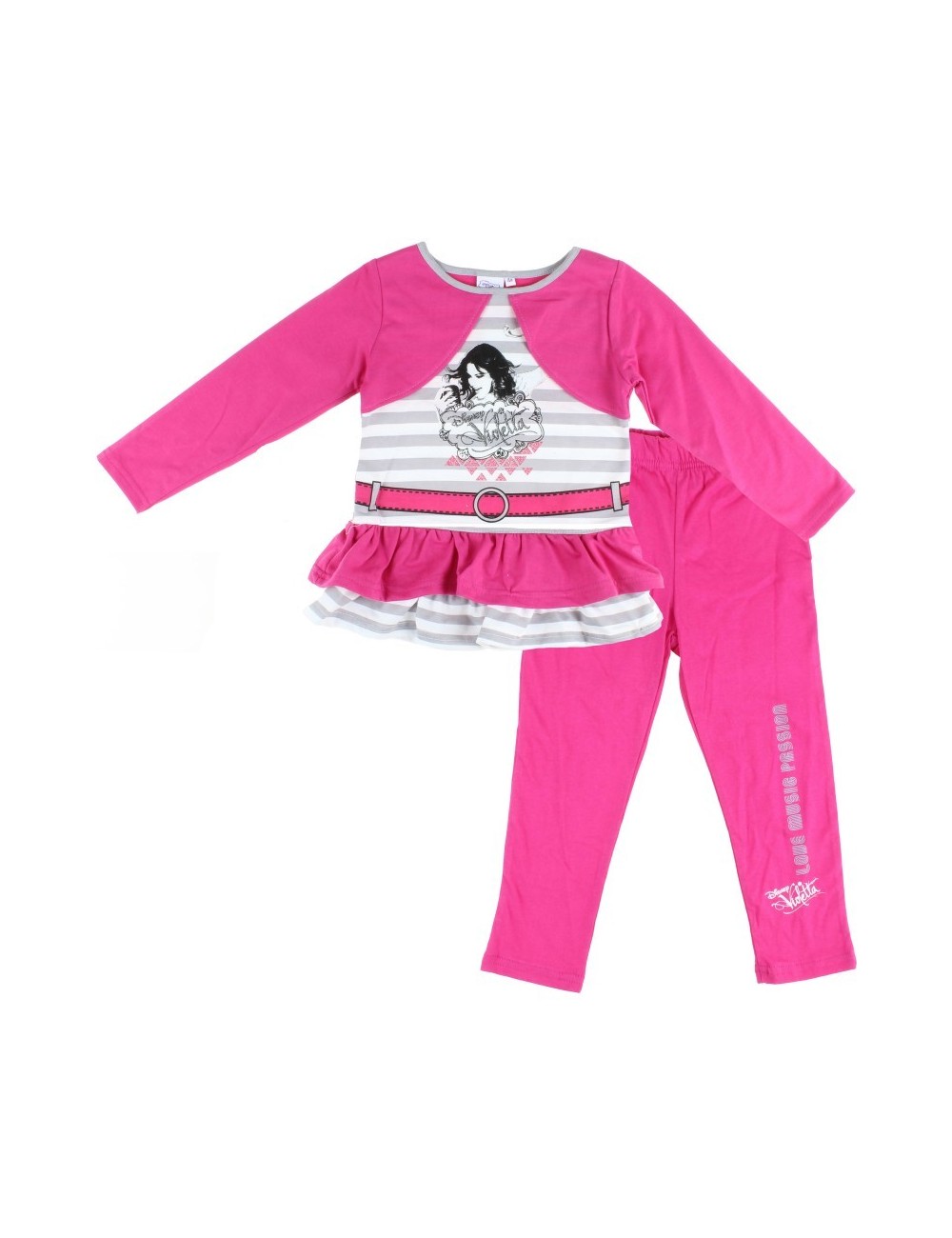 Bluza si colanti roz, Disney Violetta: bluza cu maneca lunga (80% Poliester, 20% Bumbac) cu un bolero aplicat si doua volanane alb-roz, imprimeu glitter cu Violetta; colanti din bumbac 100% imprimati cu logo-ul Violetta.