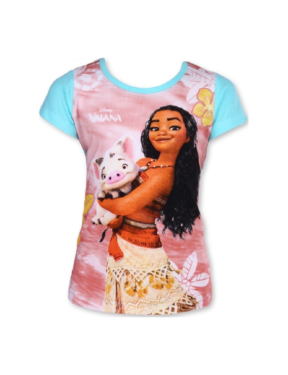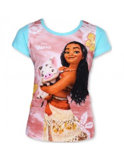 Tricou Vaiana si Pua pentru copii 3-8 ani, maneca scurta, culoare turcoaz, imprimeu multicolor, bumbac 100%, decolteu rotund.