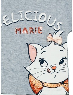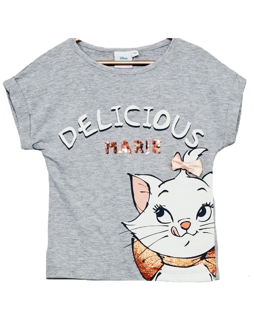 Tricou gri, Pisicuta Marie Delicious, pentru fete de 3-8 ani, confectionat din material de calitate, 92% bumbac, 8% poliester, accesorizat cu paiete si sclipici roz si o fundita din satin roz.