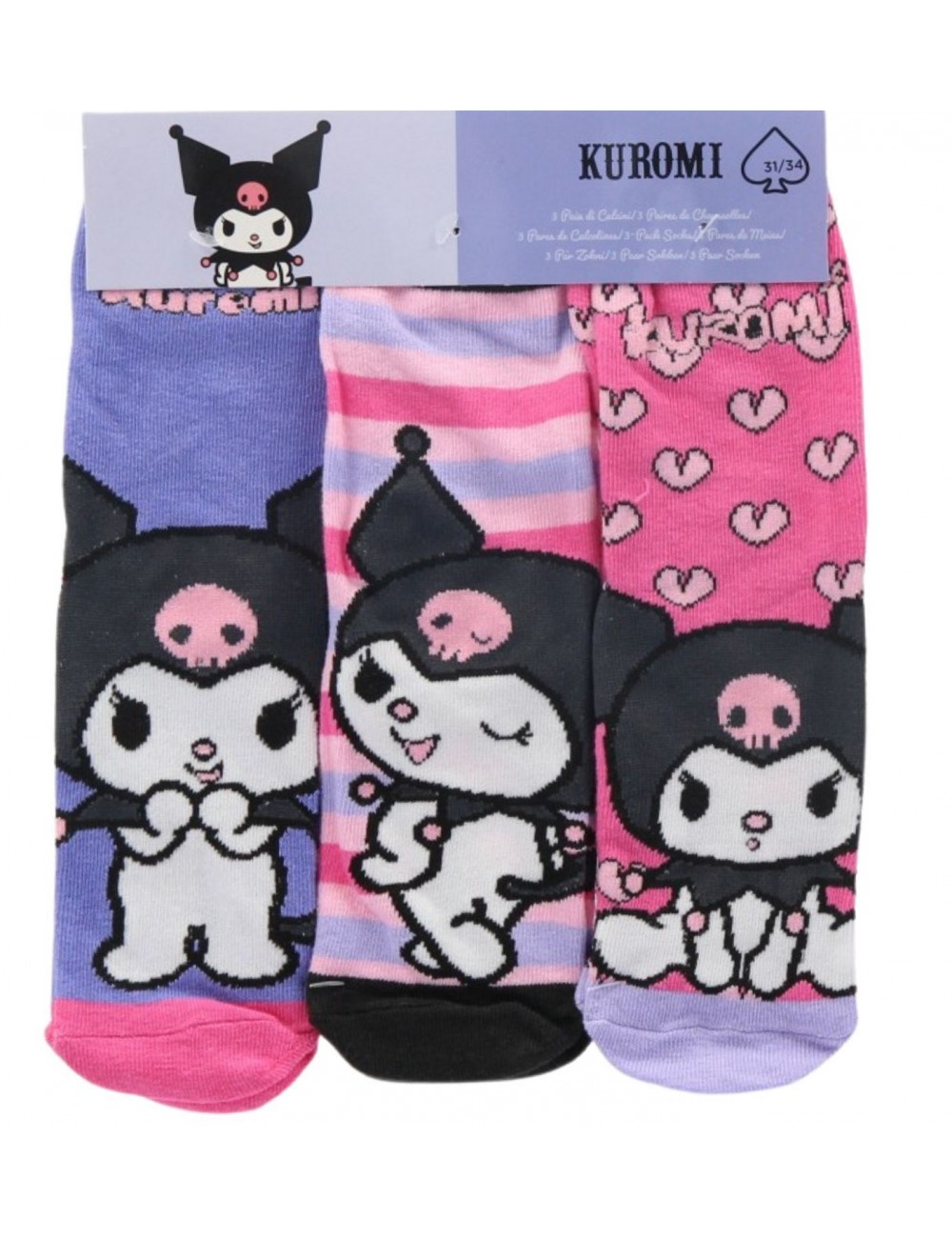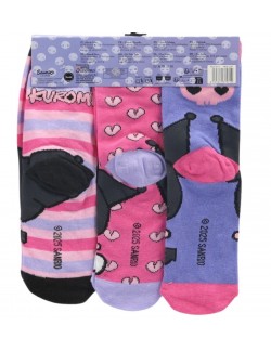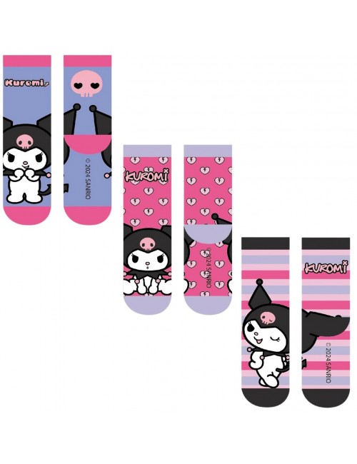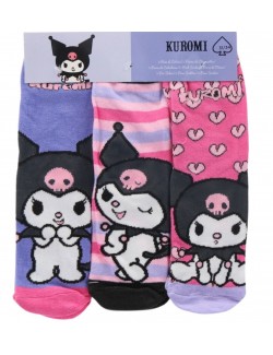 Set 3 perechi sosete Kuromi Hello Kitty, marimi 23-34, imprimeuri diferite, compozitie material 60% bumbac, 37% poliester, 3% elastan.