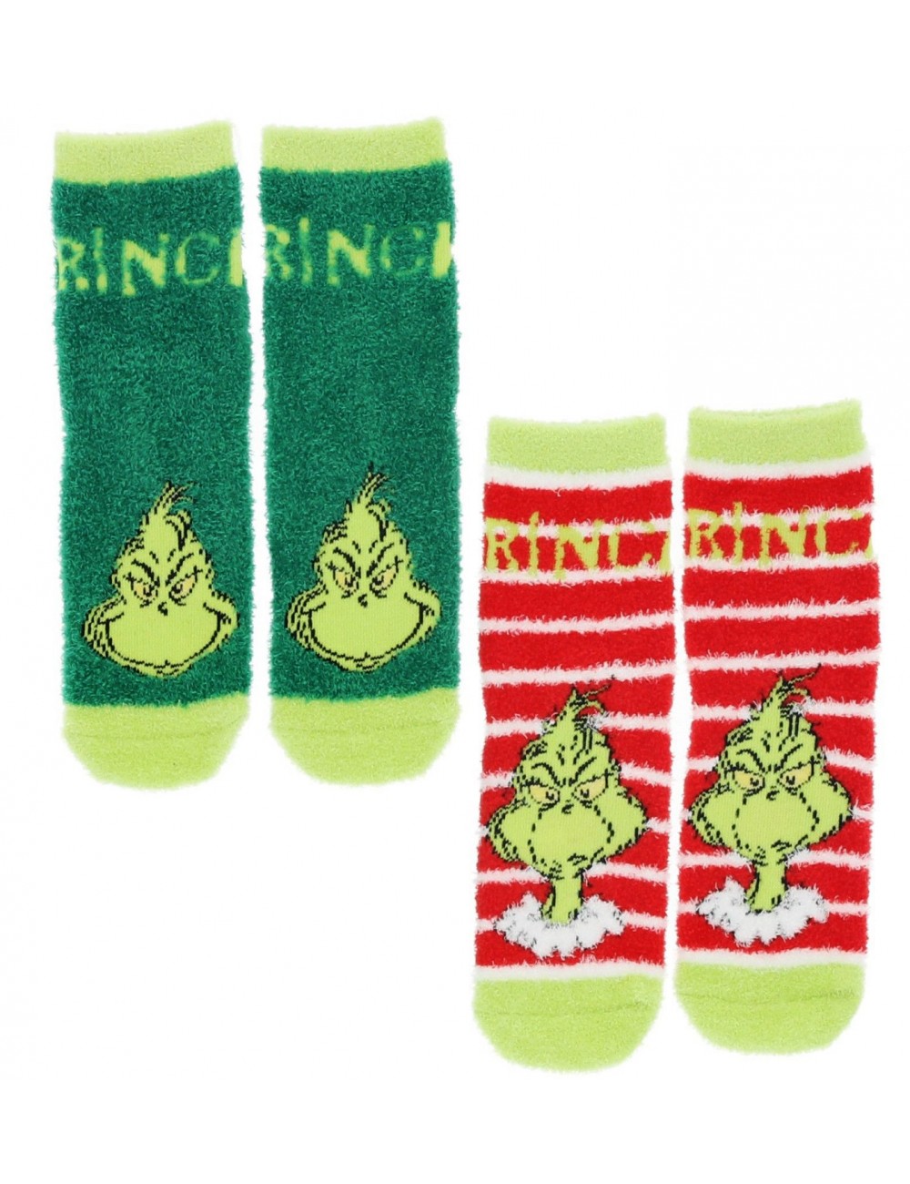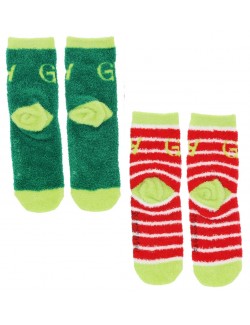 Set 2 perechi sosete fluffy, Grinch, marimi 23-34, imprimeuri si culori diferite, cu puncte antiderapante pe talpa, compozitie material 78% bumbac, 20% poliester, 2% elastan.