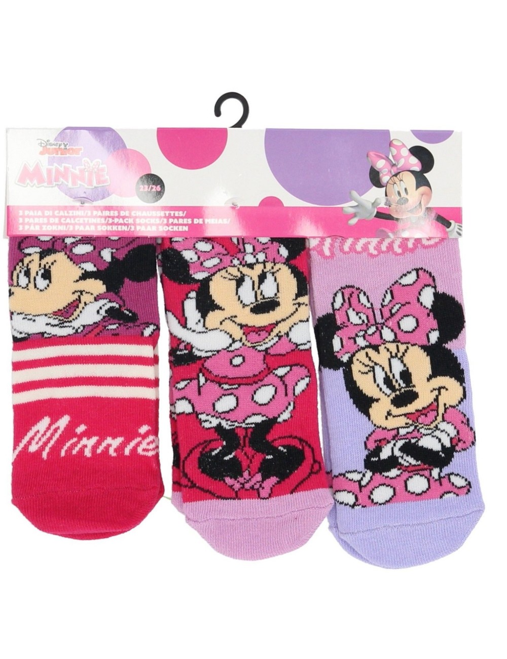 Set 3 perechi sosete, Disney Minnie Mouse, marimi 23-34, imprimeuri diferite, culori intense, compozitie material 60% bumbac, 37% poliester, 3% elastan.