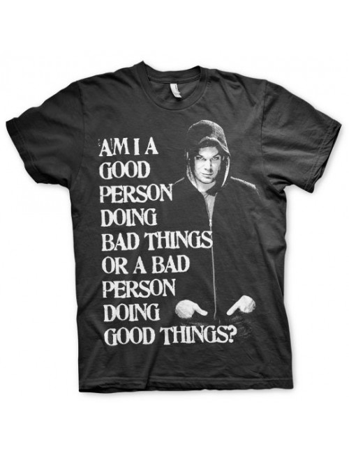 Pentru fanii serialului Dexter, va oferim acest tricou de culoare neagra, imprimat cu imaginea protagonistului si intrebarea "Am i a good person doing bad things or a bad person doing good things?".