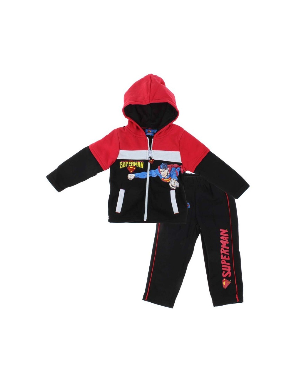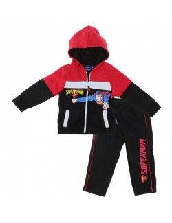 Trening pentru baieti de 2-8 ani, bluza are gluga si fermoar si un imprimeu Superman. Disponibil in doua combinatii de culori albastru-bleumarin si rosu-negru