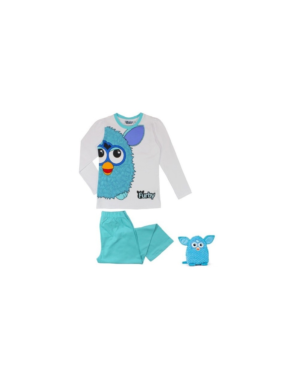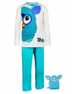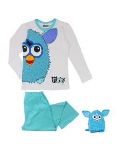 Pijama Furby, pentru copii de 5 ani, contine bluza alba cu maneca lunga si pantaloni turcoaz, bumbac 100%.