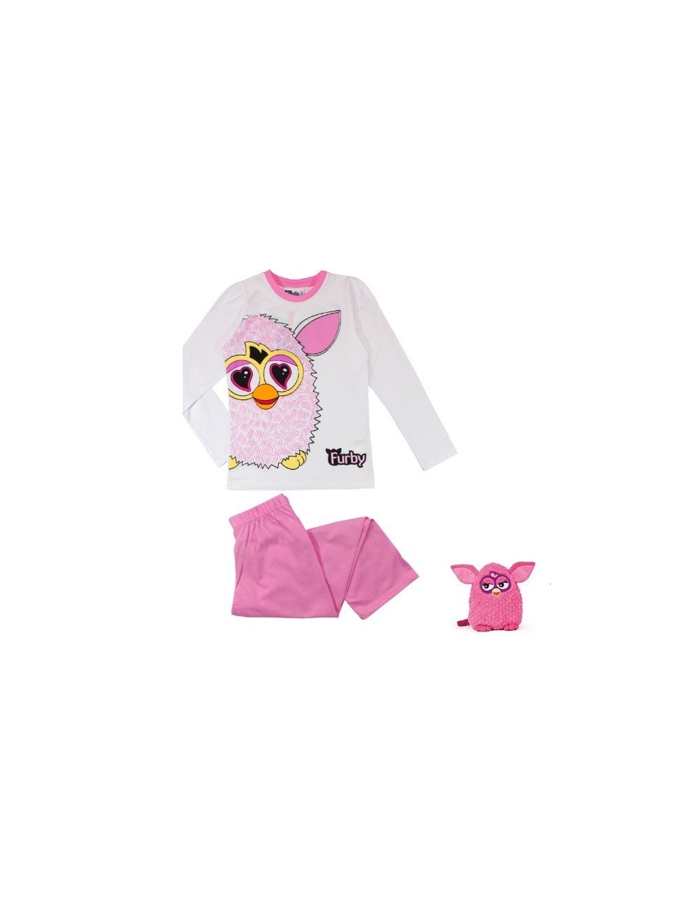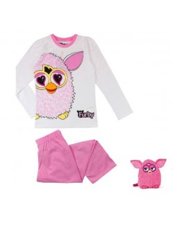 Pijama Furby, alb-roz, bluza alba cu maneca lunga, si pantaloni lungi, culoare roz, bumbac 100%, cu imprimeu - Furby pe piept, pentru copii de 8 ani/128 cm.
