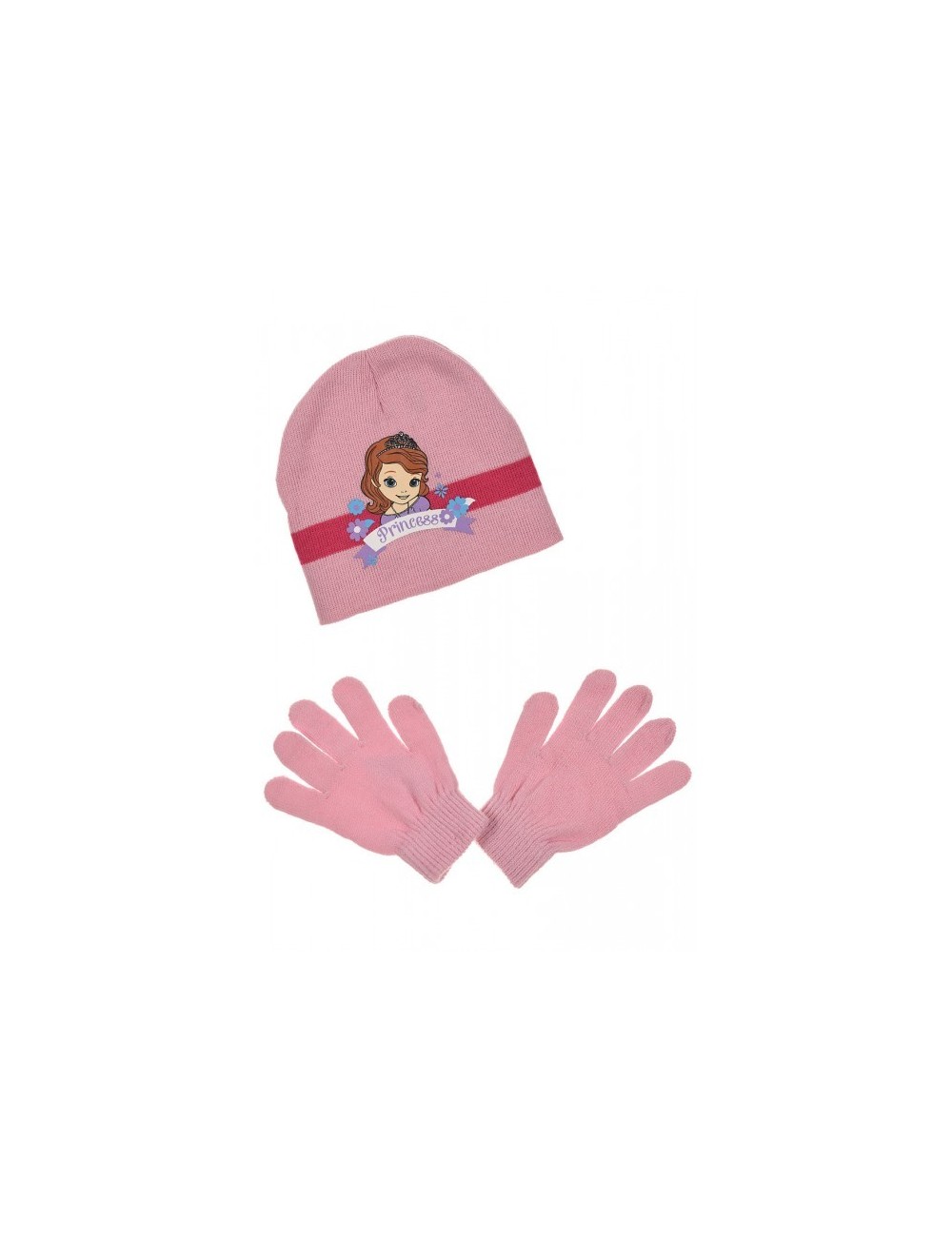 Set tricotat 2 piese: caciula si manusi cu Sofia Intai, culoare alb sau roz, marime 52 sau 54. Produs cu licenta Disney (HO4298).