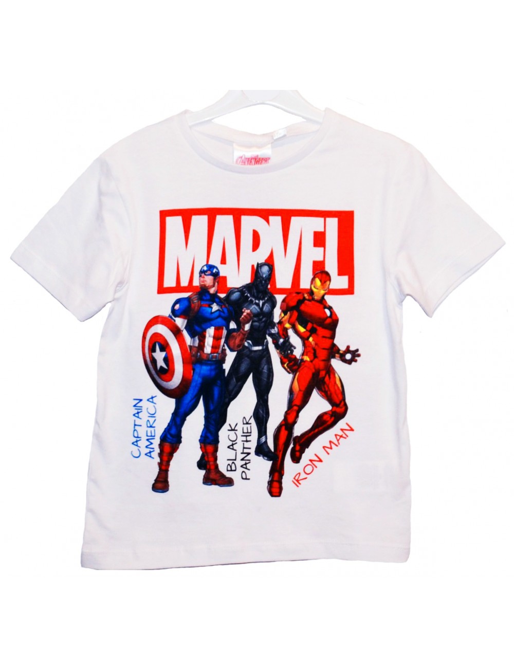 Tricou Avengers, alb, pentru copii 4-10 ani, maneca scurta, material de calitate, bumbac 100%, imprimeu frontal Iron Man, Captain America si Black Panther.