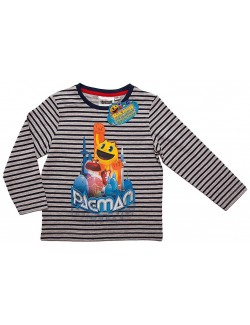 Bluza cu maneca lunga, de culoare gri cu dungi bleumarin, imprimeu mare cu personajele din jocul Pac-Man si logo-ul "Pac is Back".