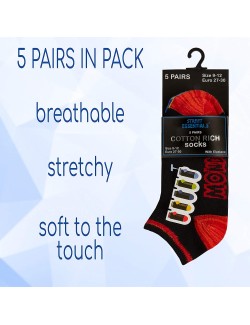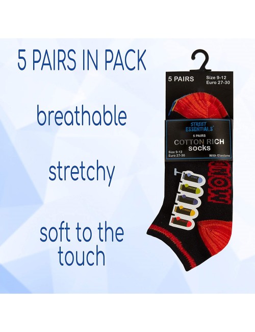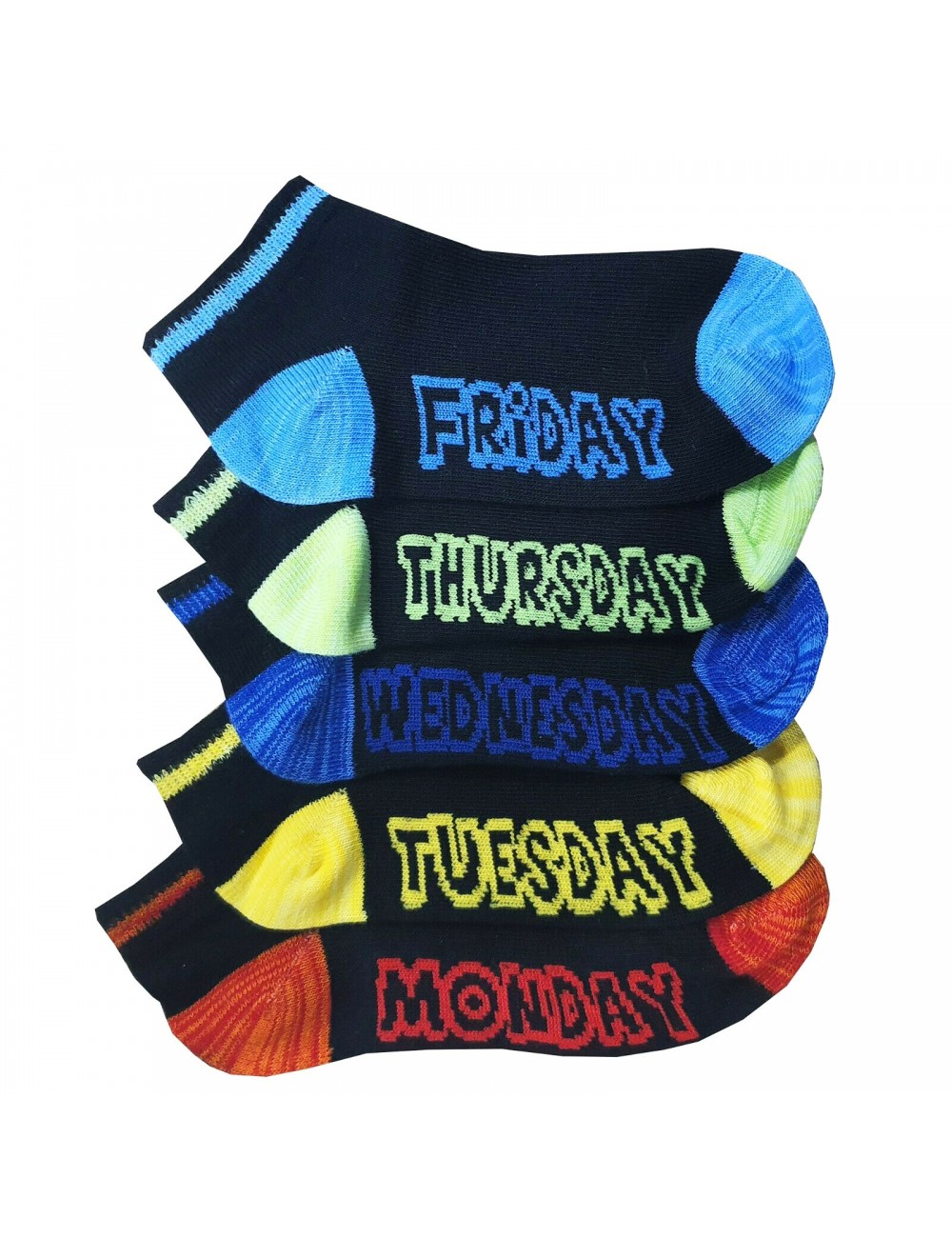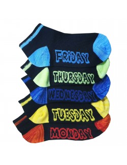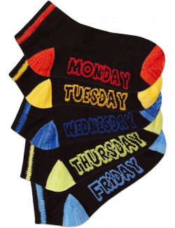 Set 5 perechi Sosete scurte, Zilele saptamanii (in limba engleza), culoare neagra, varf si calcai colorate diferit, pentru fiecare zi.
