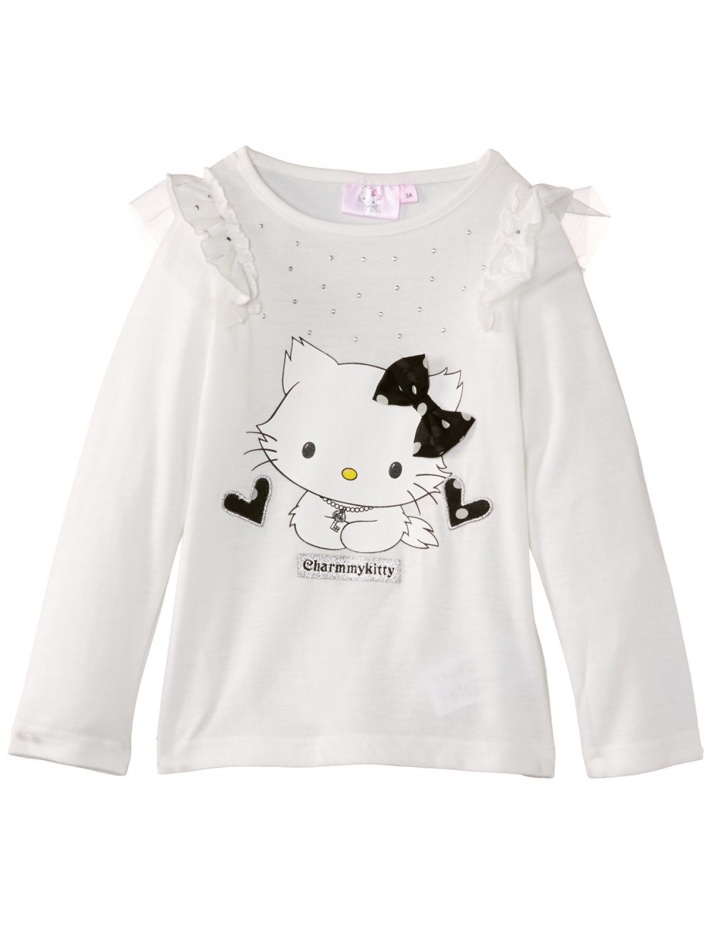 Bluza alba, cu imprimeu Charmmy Kitty, aspect elegant, cu volanase aplicate pe umeri si o fundita aplicata pe imprimeu, 65% bumbac, 35% poliester.