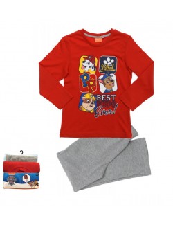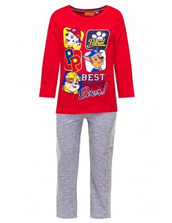 Pijama Patrula catelusilor, rosu-gri, pentru copii de 3-8 ani, alcatuita din bluza rosie (100% bumbac), cu maneca lunga si pantaloni lungi, culoare gri (90% bumbac, 10% vascoza) 100 gr/mp.