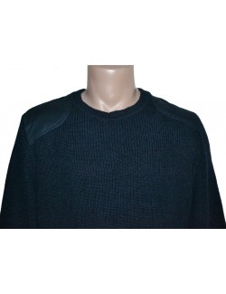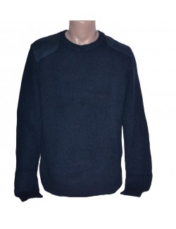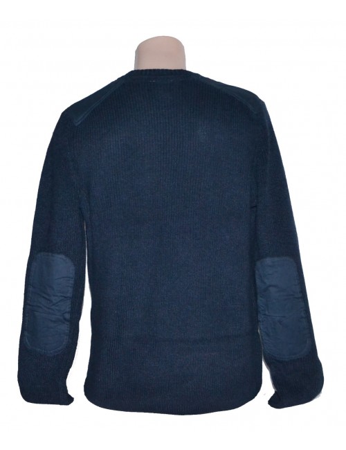 Pulover barbati, tricotat din fir de bumbac 100%, de culoare bleumarin, cu umeri si cotiere aplicate, guler rotund, la baza gatului.