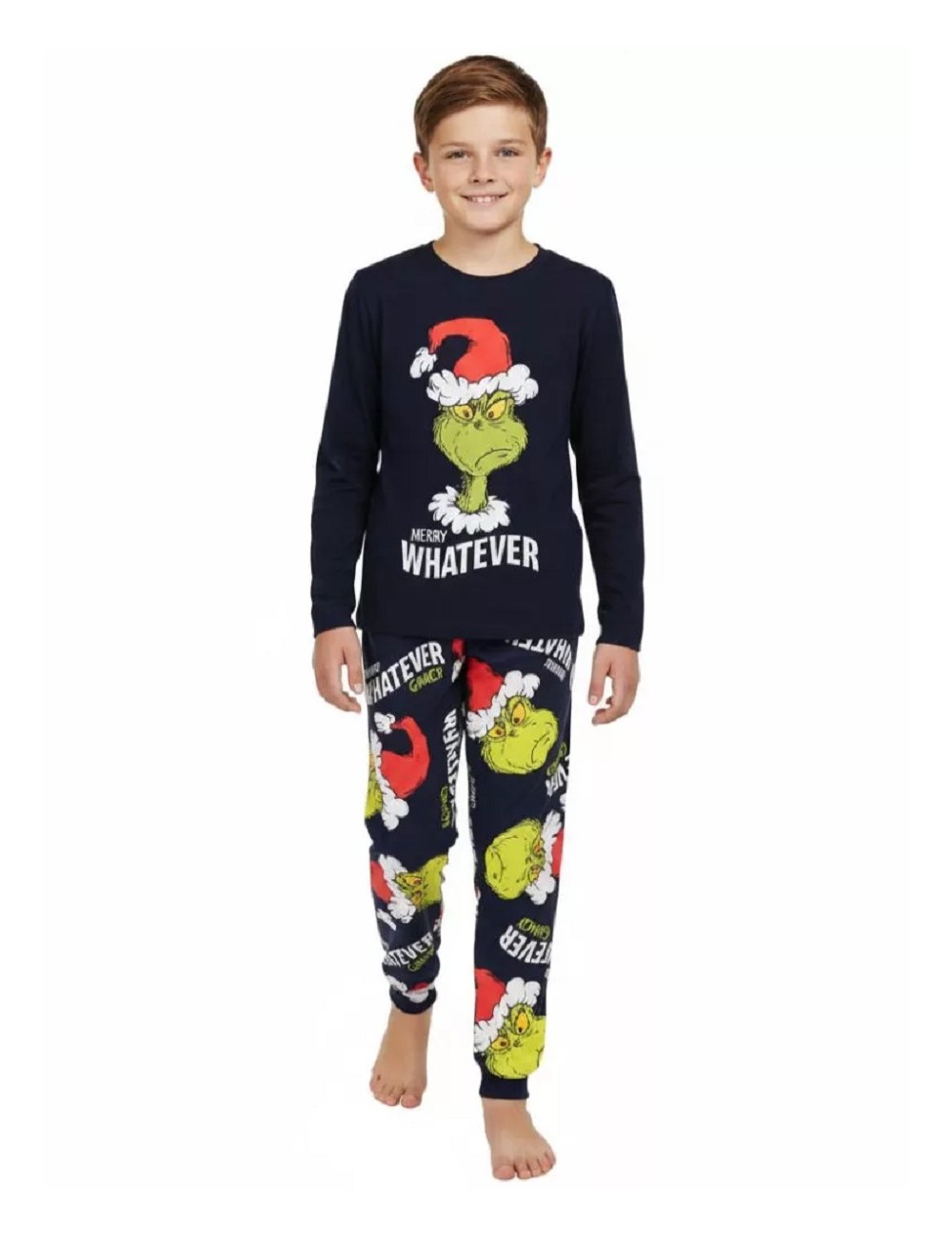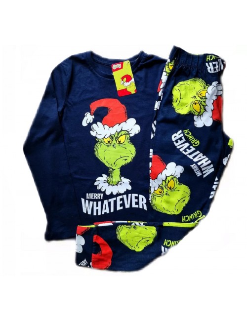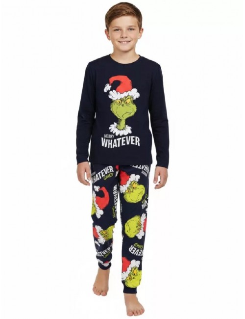 Pijama The Grinch Merry Whatever, pentru copii, 100% bumbac, contine bluza cu maneca lunga si pantaloni lungi, full-print, culori albastru inchis cu imprimeu multicolor.