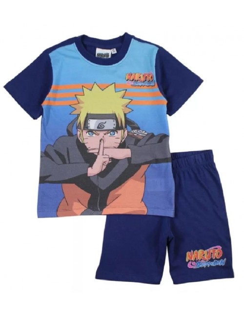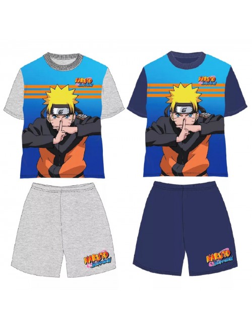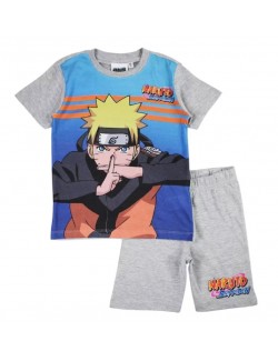 Pijama Naruto Shippuden pentru copii, culori gri (93% bumbac, 7% poliester) si bleumarin (100% bumbac), contine tricou cu maneca scurta si pantaloni scurti.