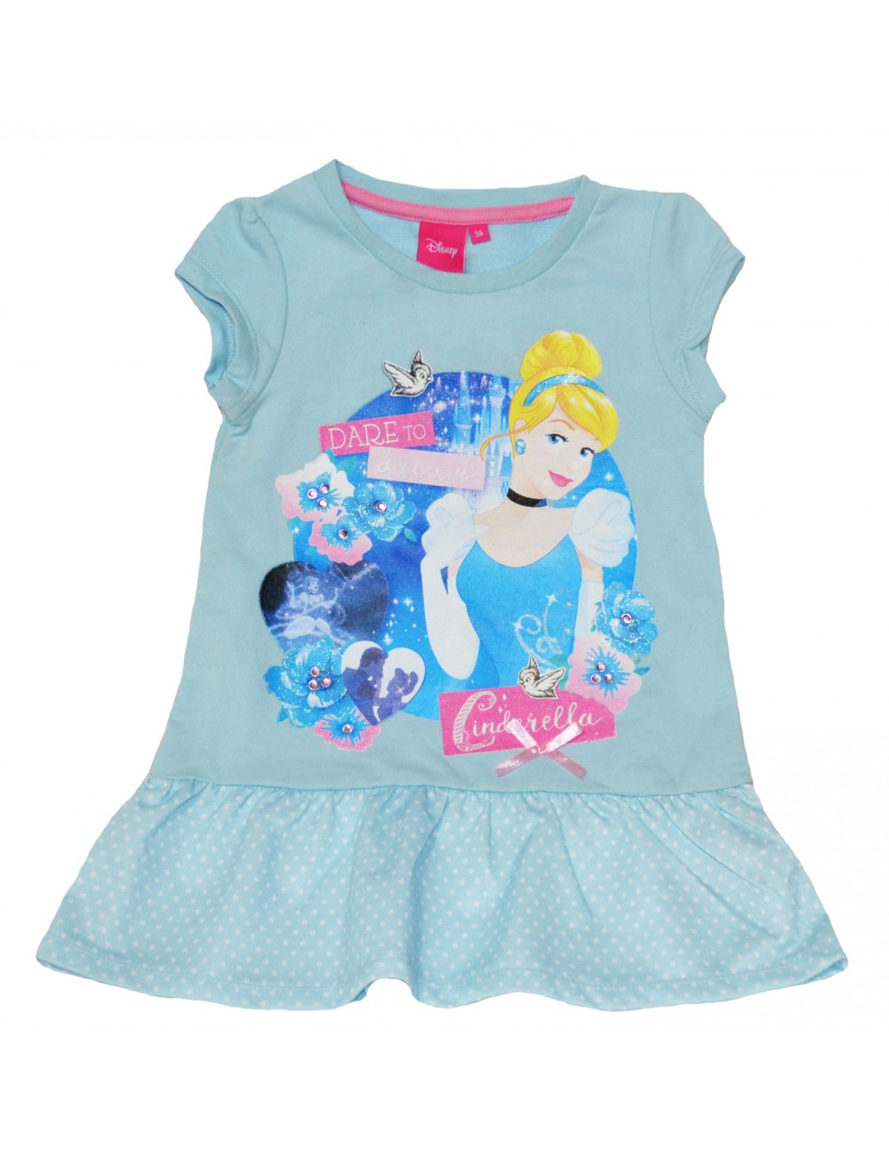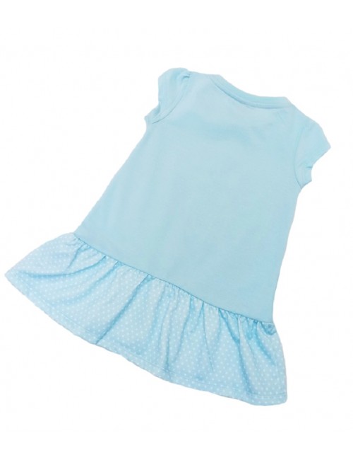 Rochie Printesa Cenusareasa, pentru copii, maneca scurta, culoare bleu, volan la baza, compozitie material 35% bumbac, 65% poliester.