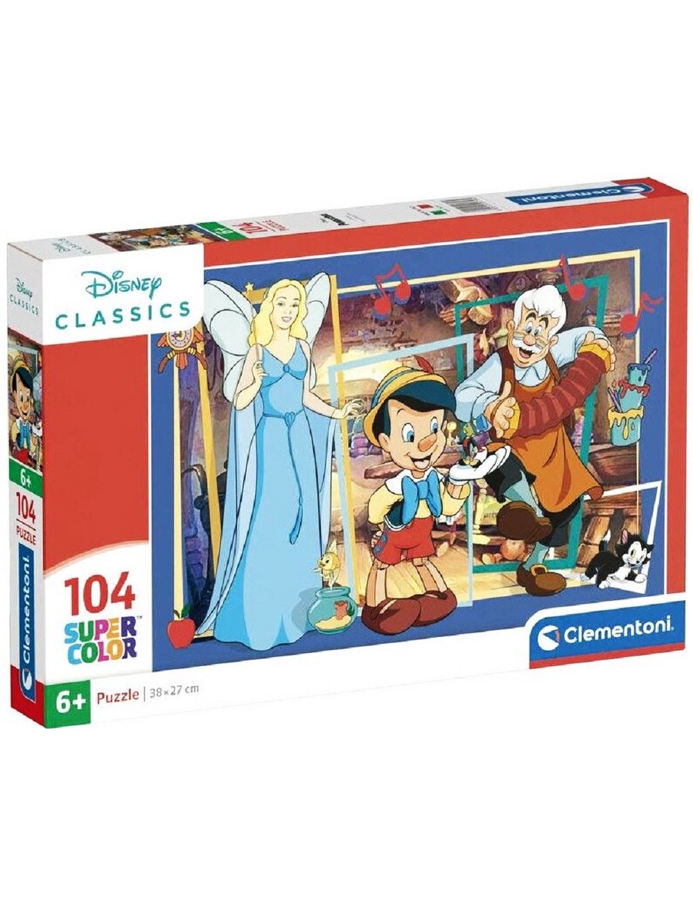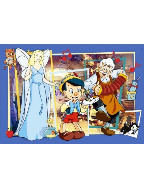 Puzzle Pinocchio pentru copii, contine 104 piese din carton, culori vii, care formeaza o imagine cu dimensiunile 38 x 27 cm.