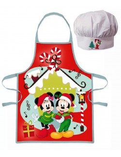 Set Bucatar, Minnie si Mickey de Craciun, din 2 piese: sort imprimat si boneta alba de bucatar, confectionat din material textil, poliester 100%, pentru copii de 3-8 ani.