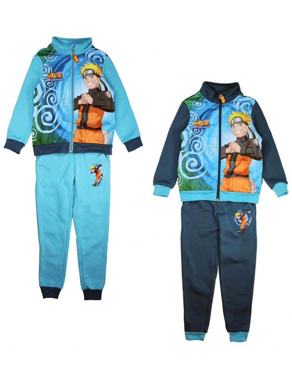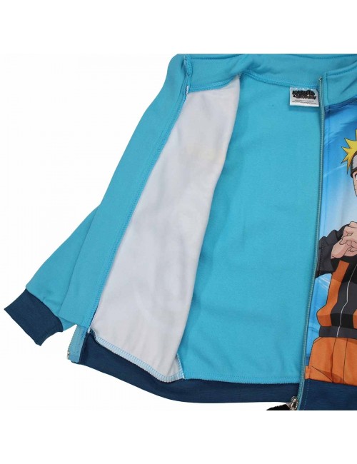 Trening Naruto Shippuden, pentru copii de 6-12 ani, bluza are inchidere cu fermoar, guler inalt, banda elastica la extremitati, pantalonii au 2 buzunare laterale, material 100% poliester. Culori: turcoaz si albastru deschis.