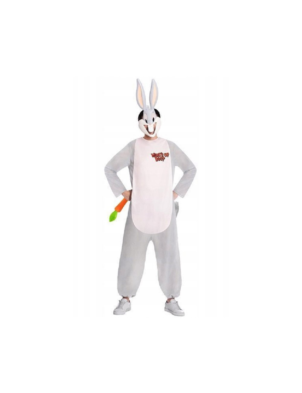 Costum Iepure Bugs Bunny pentru adulti, include: salopetă din material placut, plus subtire gri-crem, cu codita alba, 100% poliester și masca din spuma.