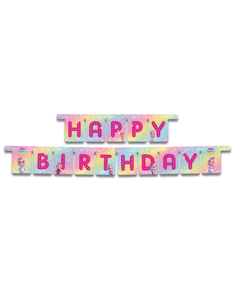 Ghirlanda Cry Babies Happy Birthday, lungime 300 cm, din carton, dimensiune litera aprox. 16,5 x 11,5 cm.