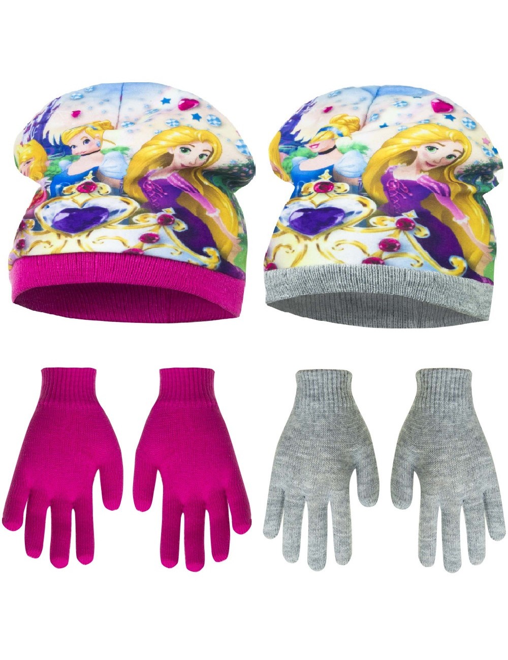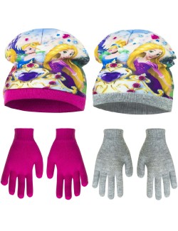 Set caciula si manusi Printese Disney-Rapunzel, Cenusareasa si Aurora, culori roz sau gri, caciula din 2 straturi material: exterior din polar fleece (100% poliester), interior din fir acrilic 100% si manusi tricotate din fir acrilic 100%.