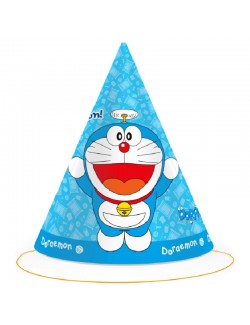 Set 6 coifuri Party Doraemon, din carton, culoare albastra, iprimeu cu pisica-robot din secolul 22, dimensiuni 16 x 11 cm, prindere cu elastic.