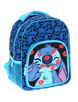 Ghiozdan gradinita Stitch Kiss, 30 x 24 x 14 cm, are un compartiment incapator si un buzunar frontal, ambele inchise cu fermoar, bretele reglabile, buretate si maner central.