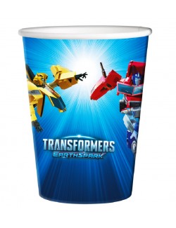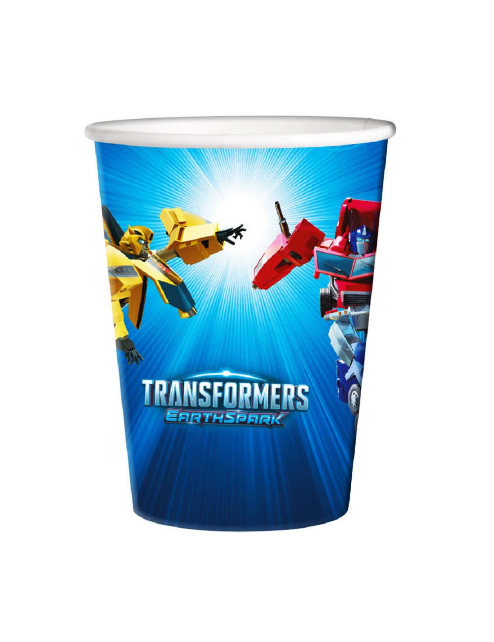 Set 8 pahare Transformers, capacitate 250 ml, de unica folosinta, din carton, culori intense, perfecte pentru petreceri ale fanilor jocurilor video sau seriei de filme SF Transformers.