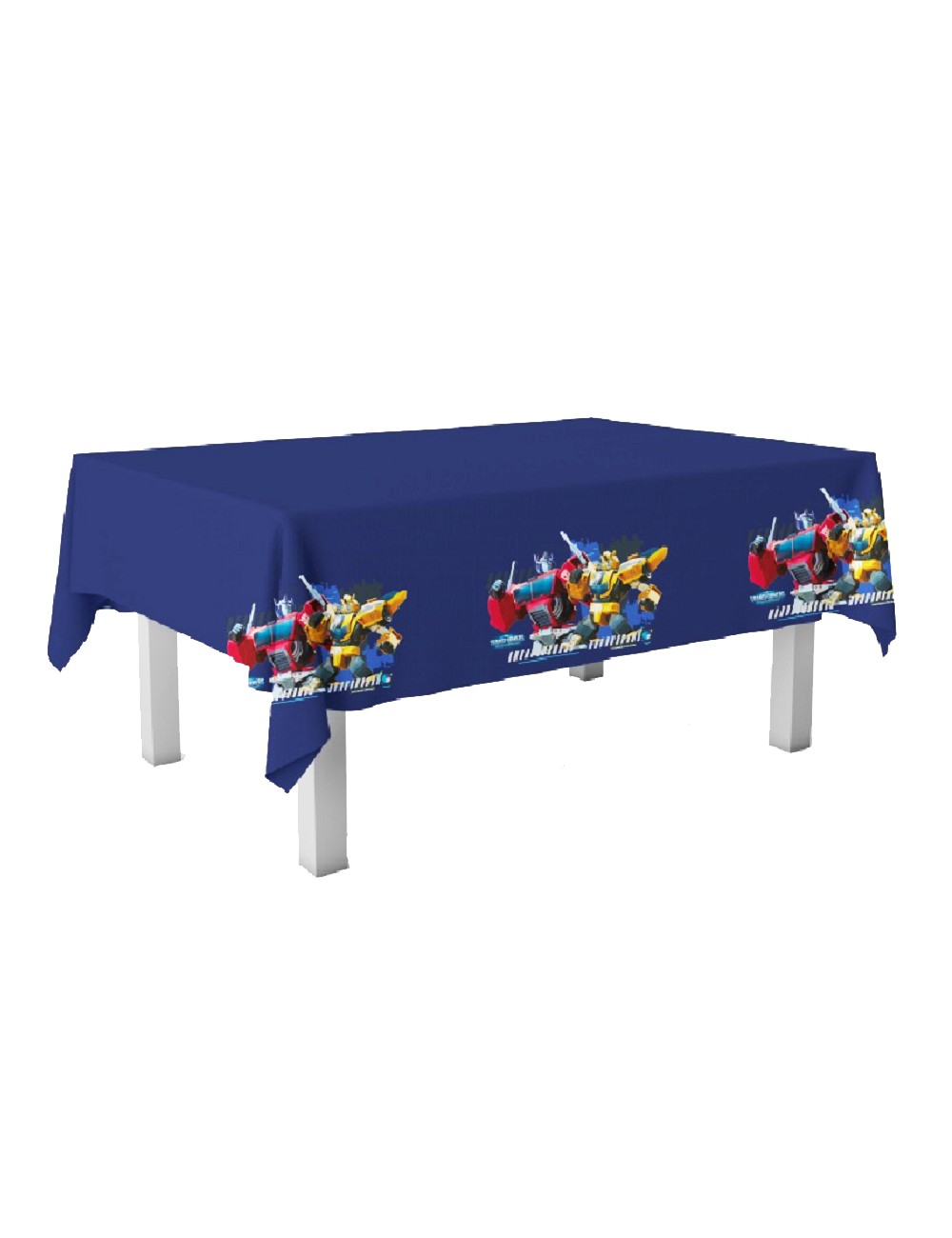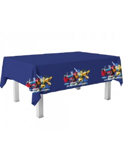 Fata de masa Transformers, din plastic, dimensiuni 180 x 120 cm, culoare albastra cu imprimeu multicolor, pentru petreceri tematice.
