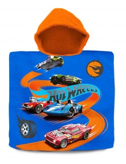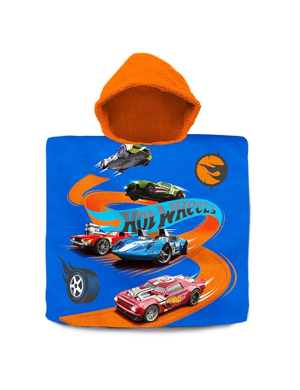 Prosop poncho Hot Wheels, 60 x 120 cm (extins), cu gluga, bumbac 100%, culori albastru-portocaliu.