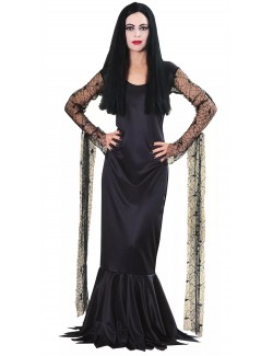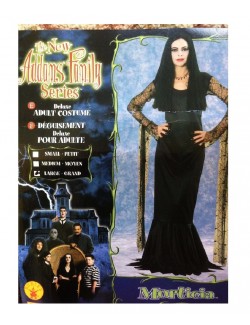 Rochie Morticia Addams Deluxe, marimea M, confectionata din lycra si dantela. Rochia este dreapta, cu un volan mare si maneci din dantela.