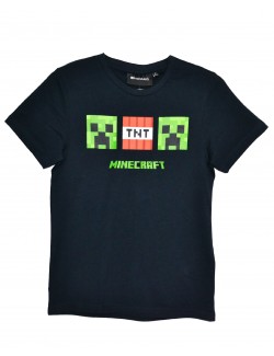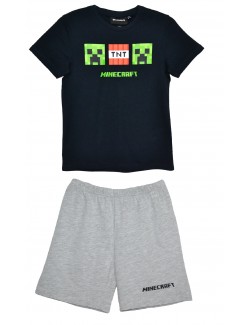 Pijama Minecraft negru-gri, pentru copii 6-12 ani, contine tricou negru, cu maneca scurta (100% bumbac) si imprimeu frontal Creeper si TNT si pantaloni scurti, gri (95% bumbac, 5% vascoza).