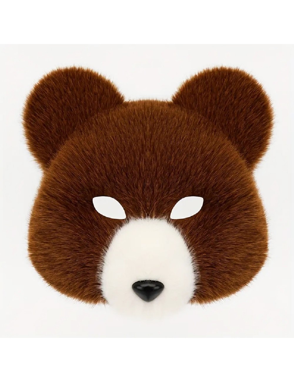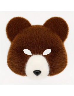 Masca Urs brun pentru copii si adulti, pe suport din plastic rezistent acoperit cu blanita sintetica maro-alb (100% poliester), prindere cu banda elastica.