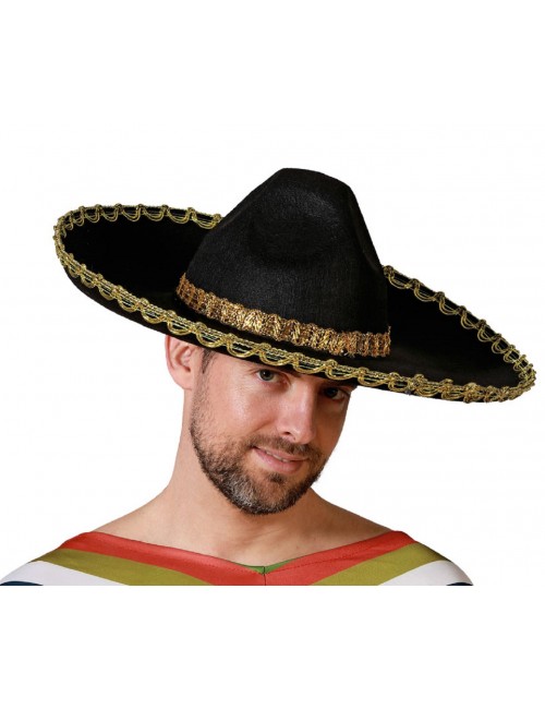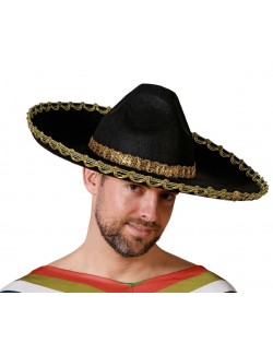 Palarie Mexicana Sombrero, pentru adulti, diametru total 45 cm, din fetru negru cu garnitura aurie, are snur pentru fixare, 100% poliester.