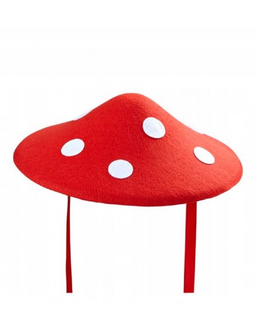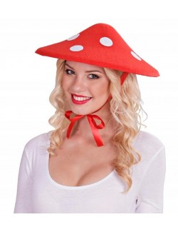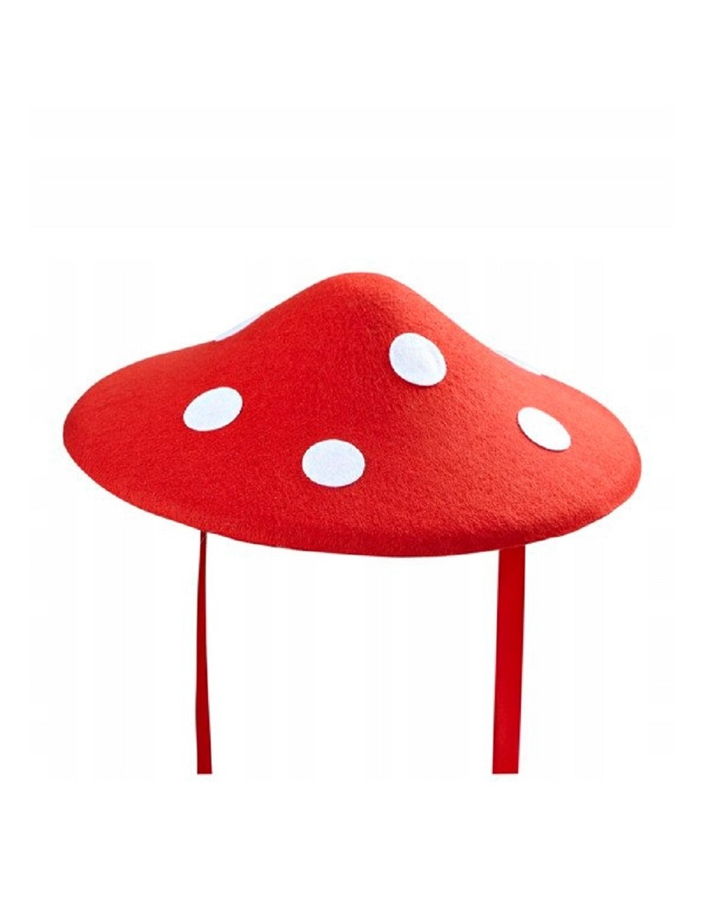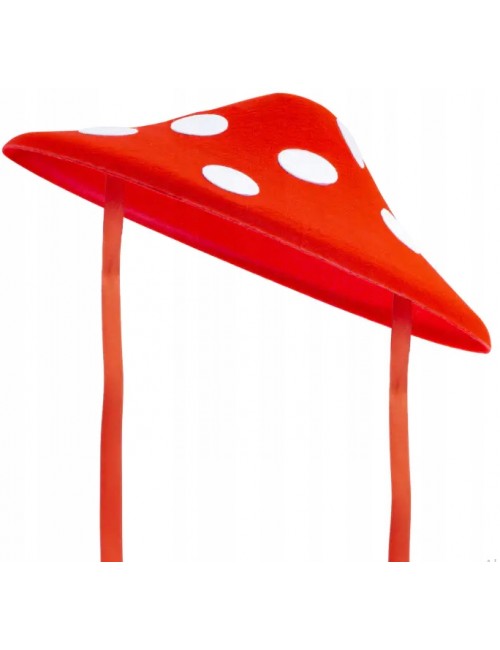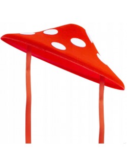 Palarie Ciupercuta pentru copii si adulti, rosie cu buline albe, din pasla rigida, prindere cu panglici, diametru: 34 cm.