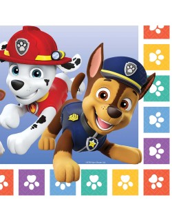 Set 16 servetele Paw Patrol, multicolore, din 2 straturi de hartie fina, imprimate cu Chase si Marshall (fata 1) si Skye si Everest (fata 2).
