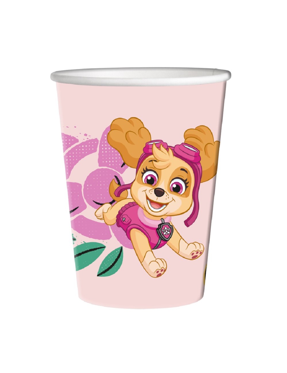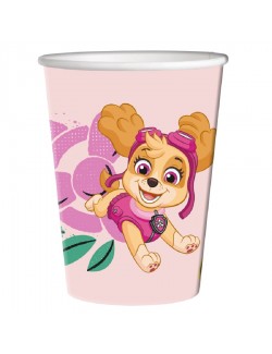 Set 8 farfurii petrecere, Paw Patrol, roz, de unica folosinta, fabricate din carton, forma patrata, latura de 23 cm, imprimate cu Skye, Everest si Chase.
