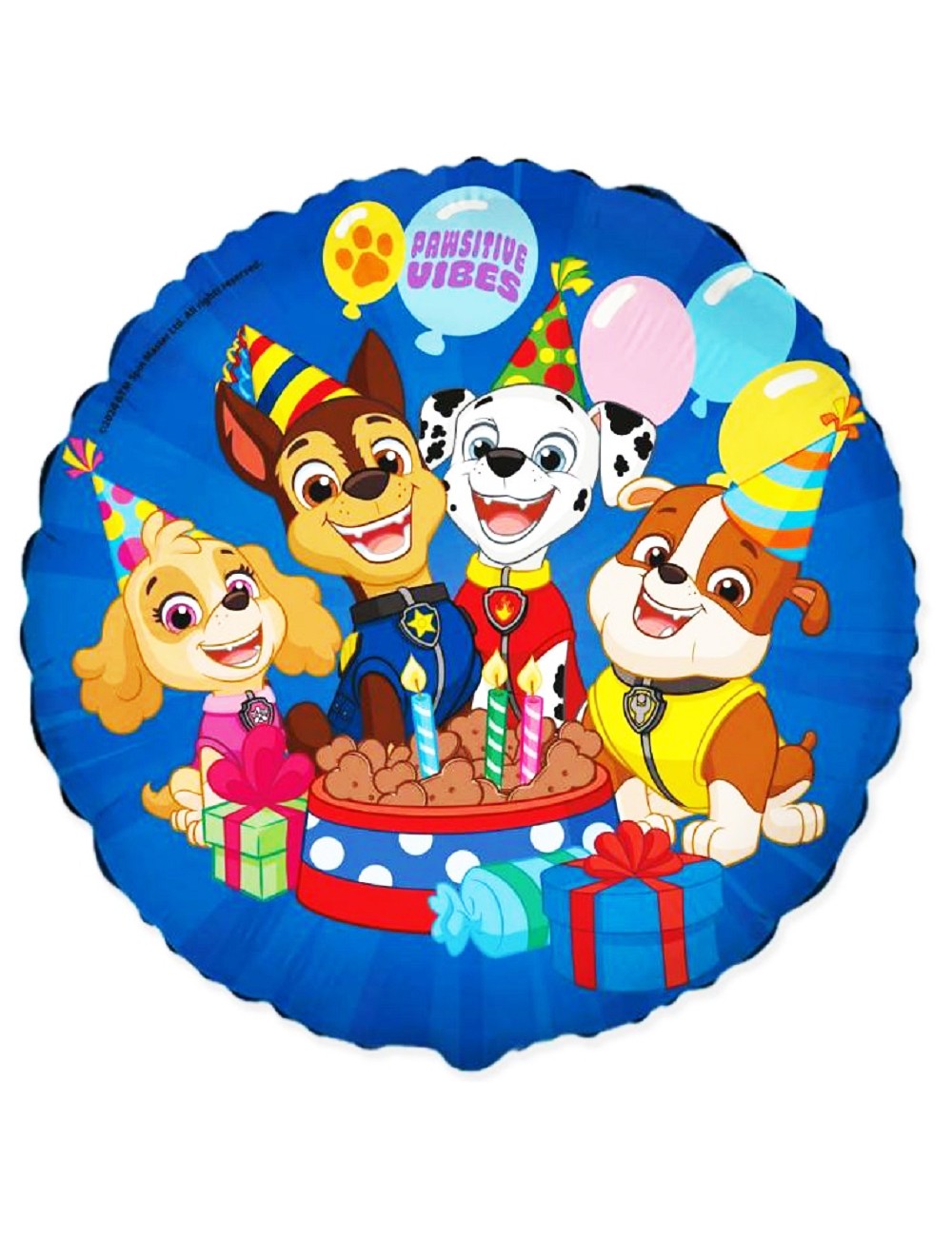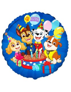 Balon folie Patrula catelusilor, diametru 46 cm (dezumflat), imprimeu identic fata-verso cu Skye, Chase, Rubber si Marshall, poate fi umplut heliu (pluteste) sau cu aer (nu pluteste).