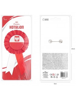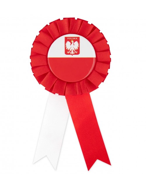 Cocarda alb-rosu Polonia, lungime 14 cm, diametru 7,5 cm, material 95% poliester, 5% plastic, prindere cu ac de siguranta.