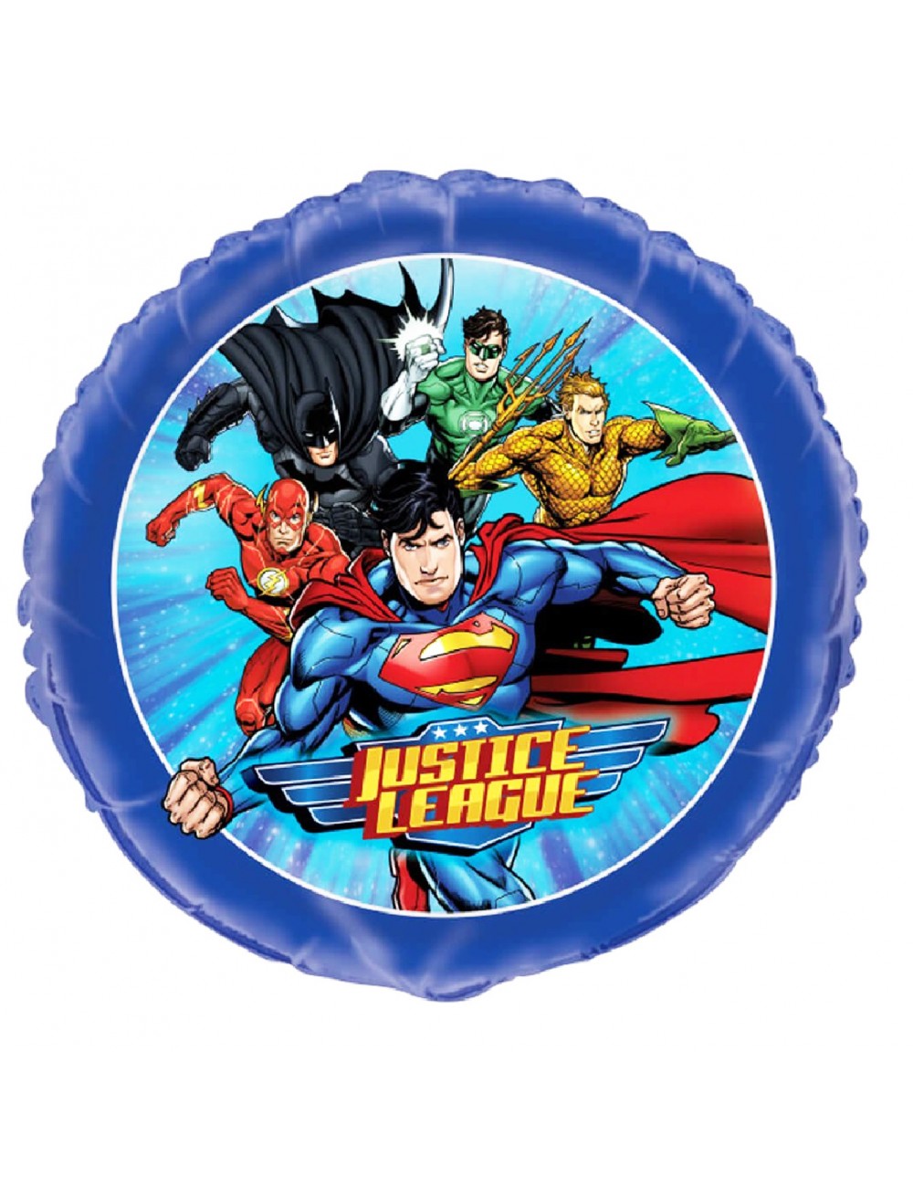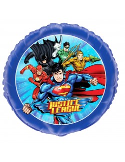 Balon folie Justice League, rotund, diametru 45 cm, multicolor, poate fi umflat cu heliu sau cu aer, imprimeu identic pe ambele parti cu supereroii Superman, Green Lantern, Batman, Flash si Aquaman.