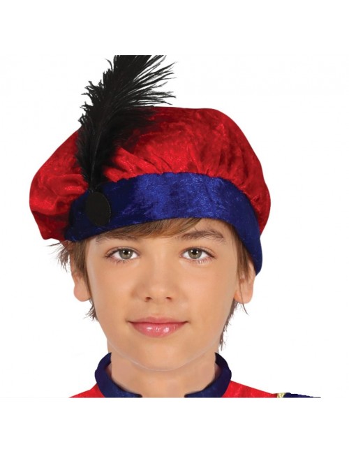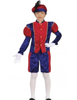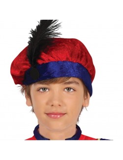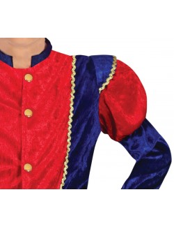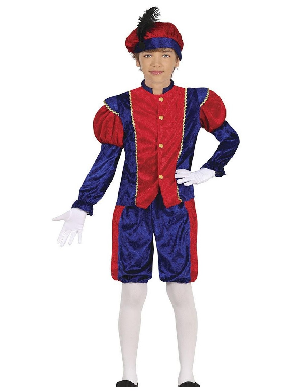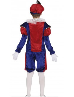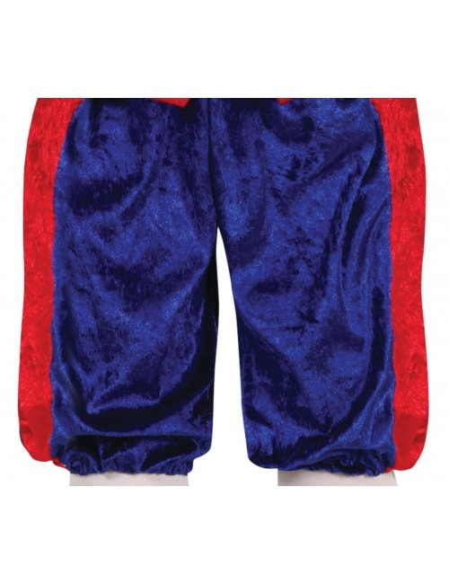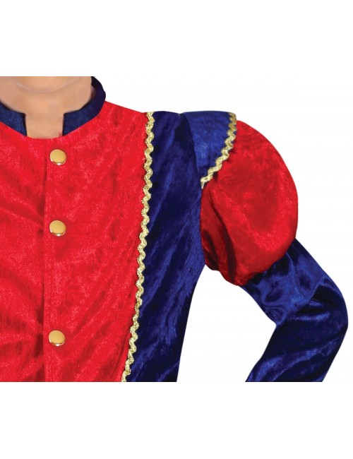 Costum Paj rosu-albastru, include: bluza cu maneca lunga, inchidere cu nasturi, pantaloni pana la genunchi si palarie cu pana, accesorizat cu banda aurie.