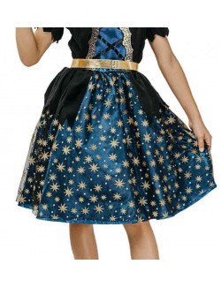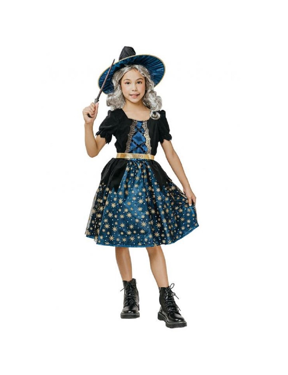 Costum Vrajitoare Celestial Witch, contine Rochie din satin si lycra, culori negru-albastru si tul imprimat cu stelute aurii, centura aurie si palarie.