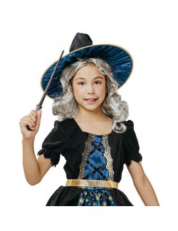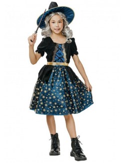 Costum Vrajitoare, Celestial Witch, contine Rochie din satin si lycra, culori negru-albastru si tul imprimat cu stelute aurii, centura aurie si palarie.